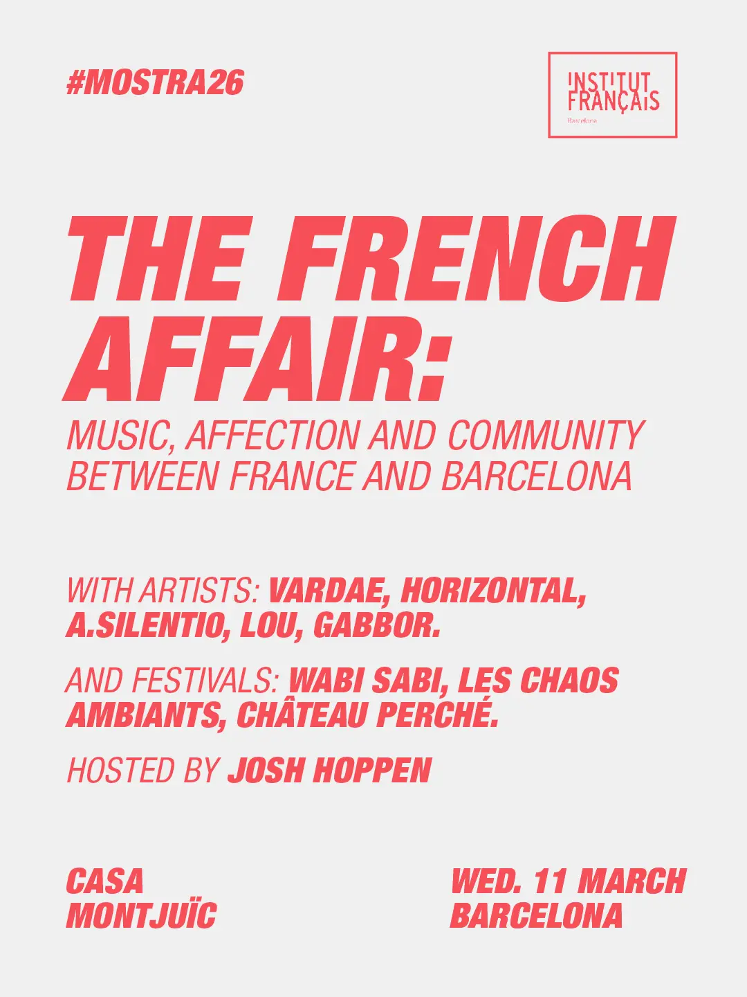 Au-delà de la musique, Mostra organise également Mostra’m, une série de débats, ateliers et rencontres. L’édition 2026 mettra la France à l’honneur, avec des discussions réunissant artistes, labels et festivals, ainsi qu’une performance de l’artiste Charly.